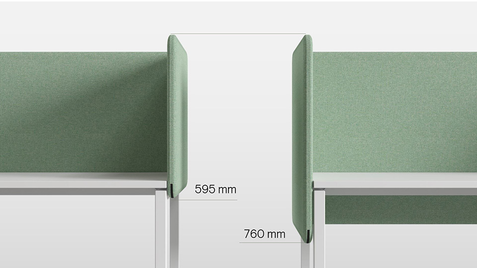 Birajte između stolnih akustičnih pregrada visine 595 ili 760 mm, pri čemu obje varijante nude 530 mm iznad površine radnog stola. Viša pregrada od 760 mm pruža zatvoreniji i privatniji radni prostor te pomaže u skrivanju električnih kabela ili druge tehničke opreme.